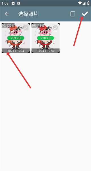 2、在照片選擇頁面,瀏覽并點擊選中要進行壓縮的照片,然后點擊右上角的確認按鈕,進入壓縮設置頁面。