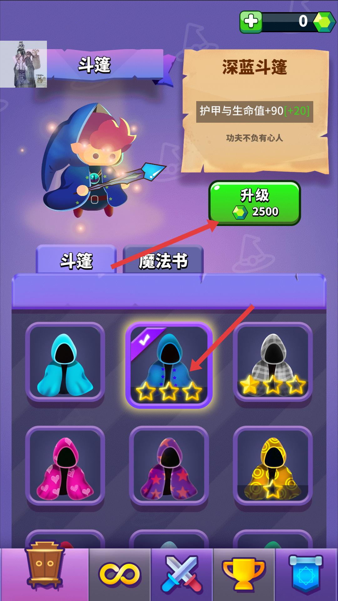 3、斗篷界面,深藍(lán)斗篷可升級(jí),消耗2500鉆石升級(jí)后,能增加護(hù)甲與生命值,提升角色生存能力,需權(quán)衡資源后選擇升級(jí)。
