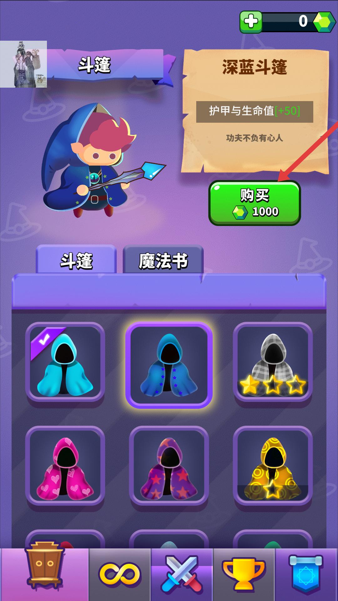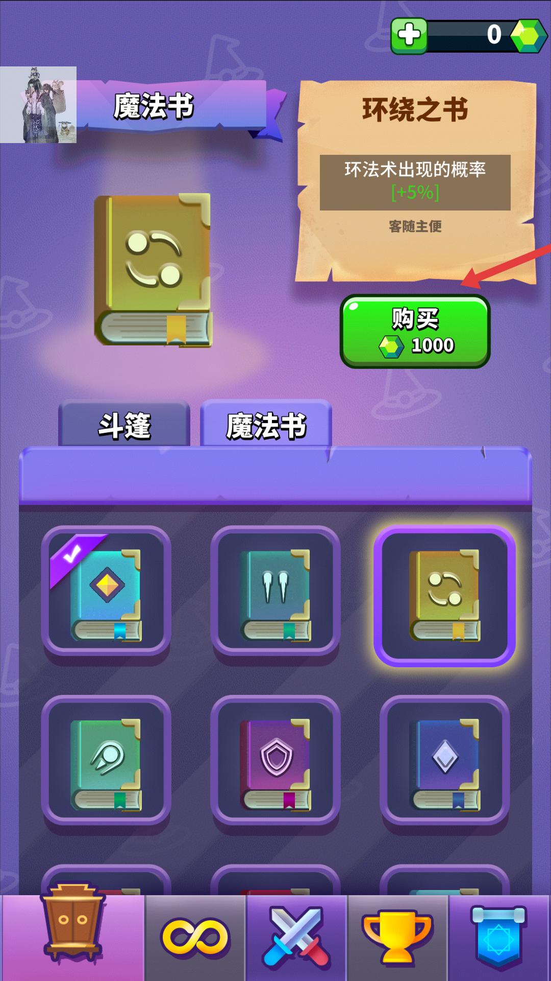 4、魔法書界面,若有1000鉆石,可購買環(huán)繞之書,它能提升環(huán)法術(shù)出現(xiàn)概率,助力戰(zhàn)斗,根據(jù)需求選擇是否購買。