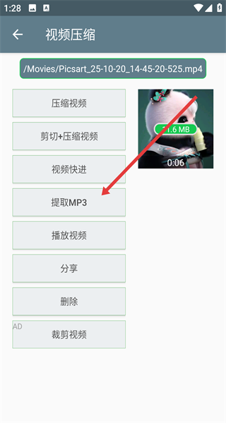 2、從選中的文件夾里找到目標(biāo)視頻,點(diǎn)擊該視頻后,在彈出的功能選項(xiàng),選擇提取MP3功能。