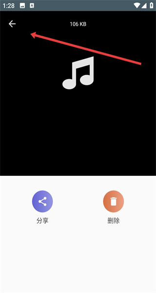 4、音頻處理完畢后,會(huì)進(jìn)入到提取好的MP3音頻界面,若不需要進(jìn)行分享或刪除操作,點(diǎn)擊界面左上角的返回箭頭,即可退出該界面。