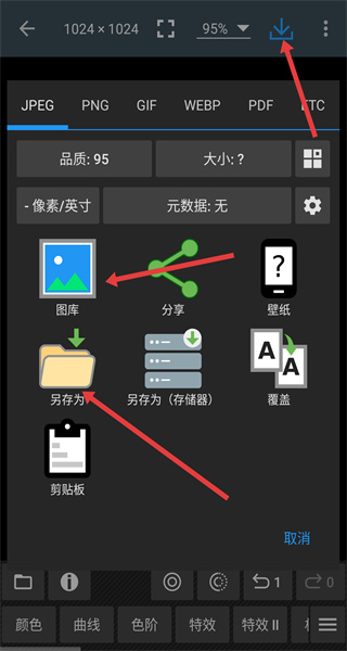 4、特效設(shè)置完成并確認(rèn)后,點(diǎn)擊界面右上角的下載圖標(biāo),在彈出的保存選項(xiàng),選擇圖庫或另存為等方式,將編輯好的圖片保存到手機(jī)中。