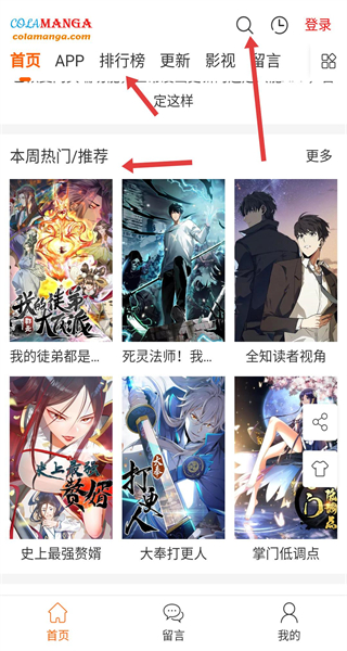 1、尋找想要閱讀的漫畫(huà)可以點(diǎn)擊排行榜探索作品或者點(diǎn)搜索圖標(biāo)開(kāi)啟查找,瀏覽本周熱門(mén)推薦板塊如死靈法師發(fā)現(xiàn)優(yōu)秀新漫。
