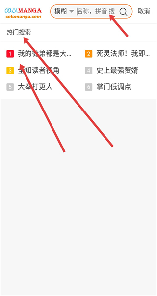 2、在搜索頁(yè)如果有想要查找的目標(biāo)可通過(guò)頂部框輸名稱(chēng)拼音搜索,或點(diǎn)熱門(mén)榜條目推薦如我的徒弟都是大反派查找漫畫(huà)。