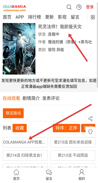 3、點(diǎn)擊進(jìn)入喜愛(ài)的漫畫(huà)死靈法師我即是天災(zāi)詳情頁(yè),可以點(diǎn)擊收藏標(biāo)記漫畫(huà)從章節(jié)列表選回目進(jìn)行跳轉(zhuǎn)閱讀。