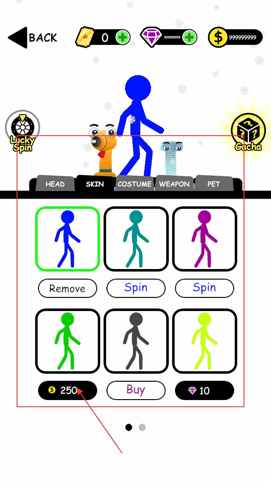 2、還可在皮膚界面消耗金幣或鉆石解鎖不同顏色的火柴人皮膚,更換皮膚可個性化角色外觀,提升游戲體驗。