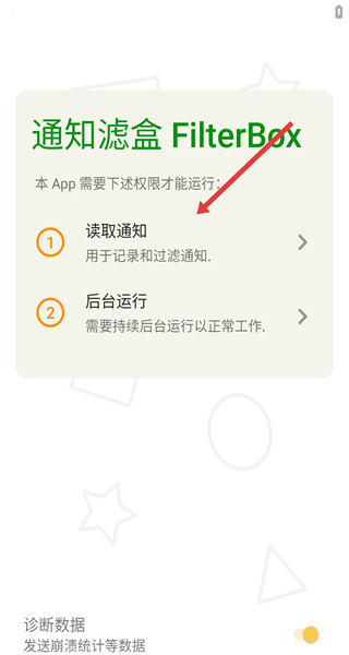 1、打開通知濾盒,在權(quán)限說明界面,找到讀取通知選項并點擊,進入通知使用權(quán)設(shè)置界面。