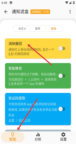 1、點擊底部智能欄在增強功能區(qū),可以開啟消除撤回使通知消除后能夠顯示5秒撤回按鈕,還可以設置智能靜音。