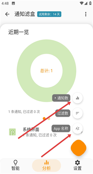 2、點擊屏幕下方切換至分析頁可以查看通知總數(shù),點擊通知App名稱按鈕能夠統(tǒng)計或篩選通知數(shù)據(jù)。