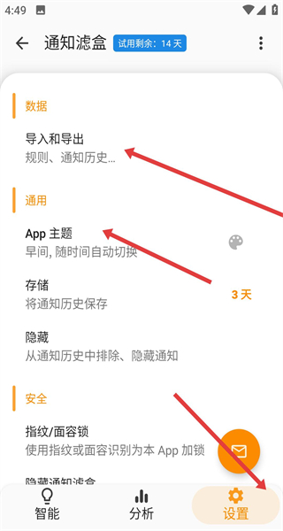 3、進入設置界面可通過導入和導出管理規(guī)則和通知歷史,還能設置App主題隨時間自動切換以及人臉識別登錄。