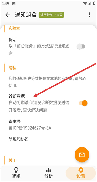4、在通知濾盒設置頁開啟診斷數(shù)據(jù)開關,自動將崩潰和錯誤診斷數(shù)據(jù)發(fā)送給開發(fā)者能夠輔助問題排查,更順利的使用軟件。
