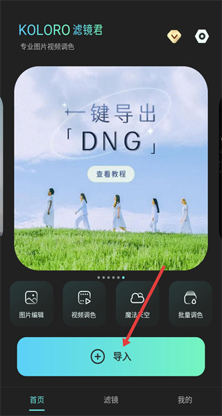 1、在首頁點(diǎn)擊導(dǎo)入按鈕選擇自己喜歡的圖片或視頻素材,導(dǎo)入后點(diǎn)擊使用濾鏡調(diào)色功能進(jìn)行處理。