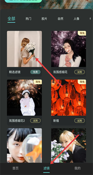 4、進(jìn)入濾鏡頁面瀏覽精選濾鏡和氛圍感煙花等效果,按需點(diǎn)擊免費(fèi)試用標(biāo)識(shí)的濾鏡為圖片添加風(fēng)格。