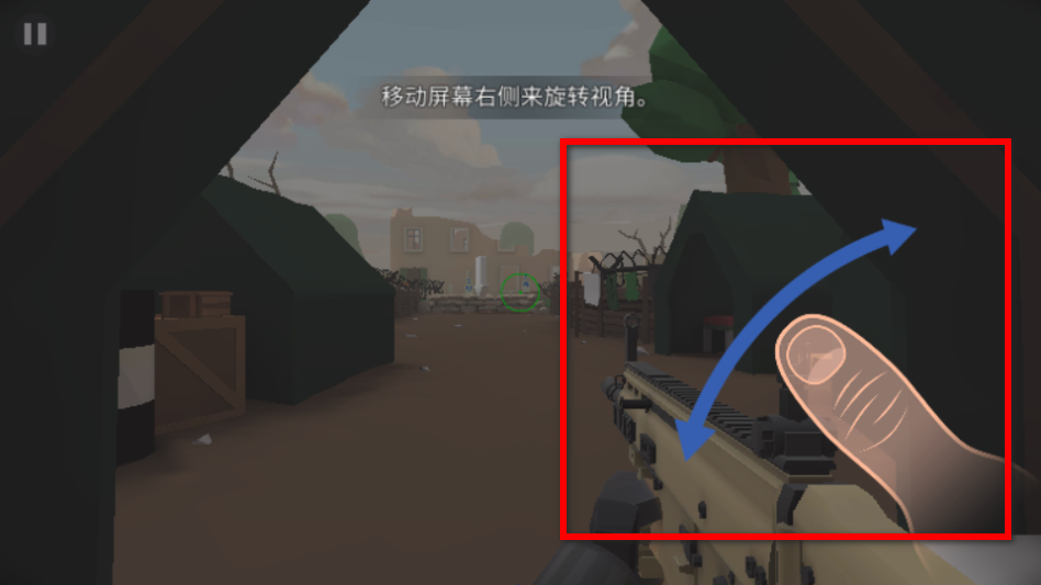 1、移動(dòng)屏幕右側(cè)來旋轉(zhuǎn)視角,旋轉(zhuǎn)視角可查看周圍環(huán)境,調(diào)整到合適視角后方便瞄準(zhǔn)目標(biāo)。