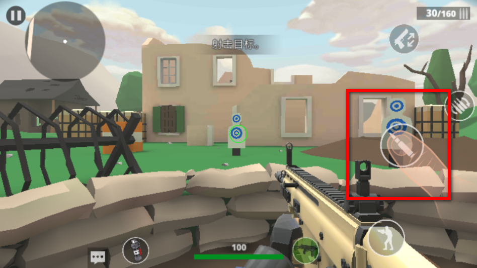 4、瞄準(zhǔn)帶有靶心的目標(biāo),點(diǎn)擊射擊按鈕開火,射擊目標(biāo)可提升射擊技巧,同時(shí)留意剩余彈藥數(shù)。