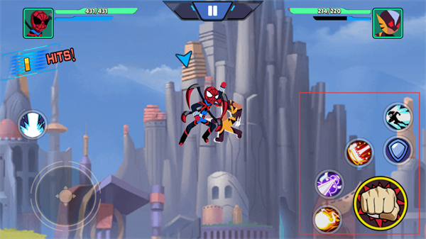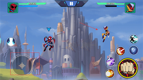 2、通過屏幕左側的虛擬搖桿控制英雄移動方向,右側的技能按鈕如拳頭攻擊、各類技能圖標釋放攻擊和技能。