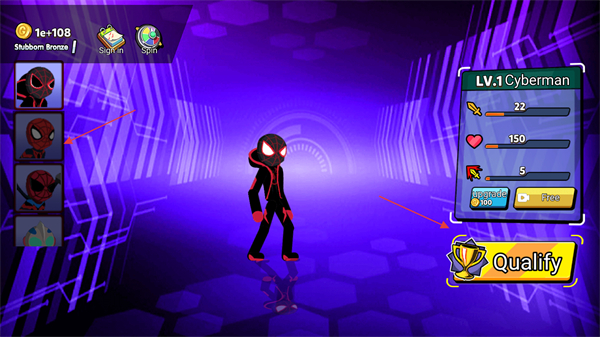 1、在英雄選擇界面挑選不同能力的火柴人英雄,點擊Qualify按鈕參與對戰(zhàn),開啟火柴人英雄之間的亂斗。