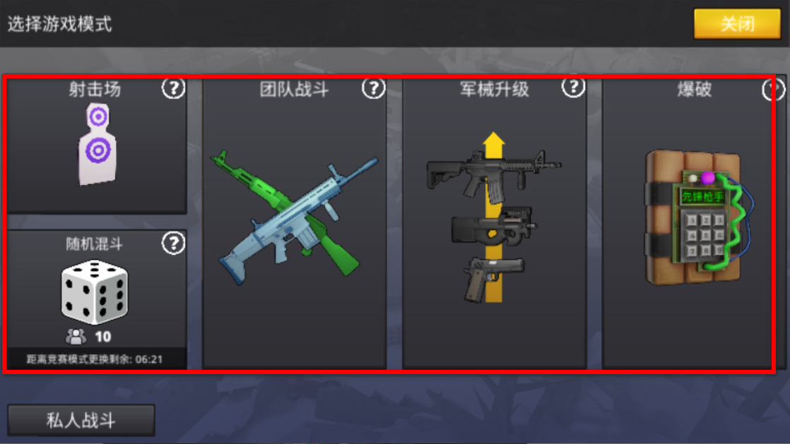 1、可選擇射擊場、團(tuán)隊?wèi)?zhàn)斗等多種游戲模式,不同模式有不同玩法規(guī)則,選擇喜歡的模式開啟射擊對戰(zhàn)。