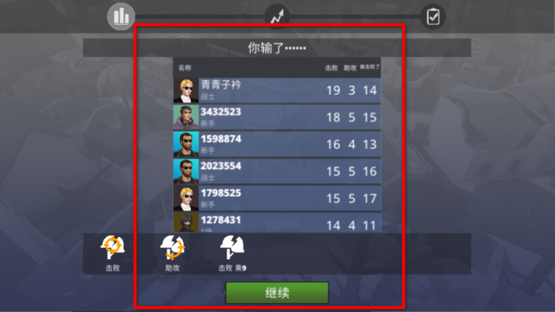 4、游戲結(jié)束后可查看對戰(zhàn)數(shù)據(jù),包括擊敗、助攻等信息,了解自身與他人表現(xiàn),點擊繼續(xù)按鈕可開啟下一場戰(zhàn)斗。