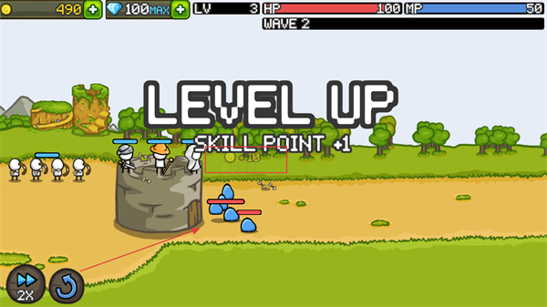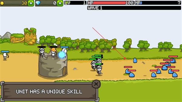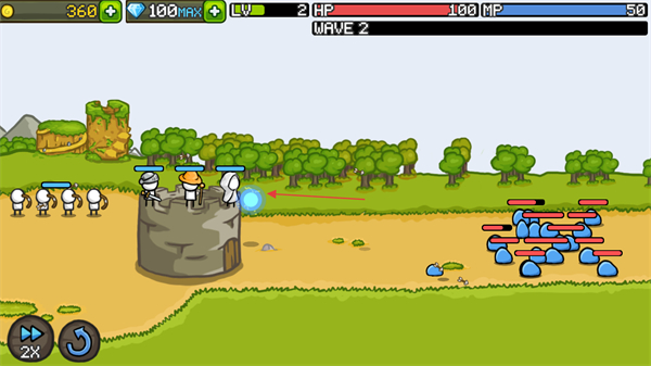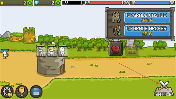 1、點(diǎn)擊BATTLE按鈕進(jìn)入戰(zhàn)斗模式在不同波次中指揮城堡上的兵種攻擊來襲的敵人,消滅所有敵人以獲取金幣和經(jīng)驗(yàn)。