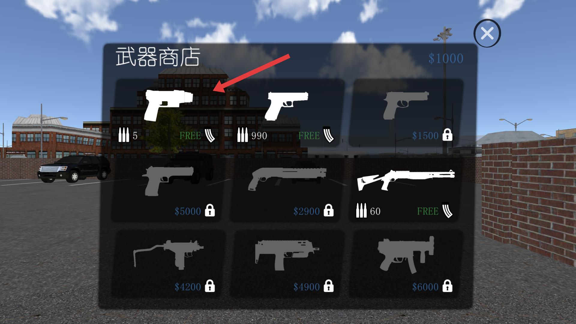 4、進入武器商店后,可選擇免費的手槍,這款手槍初始子彈5發(fā),能滿足你初期的戰(zhàn)斗需求,讓你在游戲中擁有基本的攻擊能力。