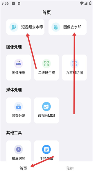 1、進(jìn)入主頁按需選擇圖像去水印,短視頻去水印或提取音頻等功能,或使用更多其他工具拓展操作。