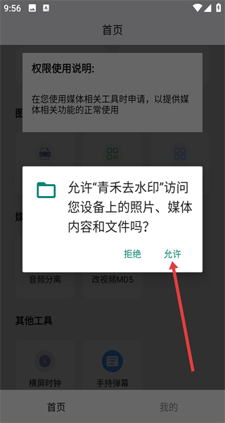 2、首次使用青禾去水印在權(quán)限申請彈窗點擊允許,授予訪問設(shè)備照片媒體內(nèi)容的權(quán)限以便更好的導(dǎo)入圖片。