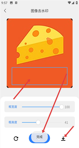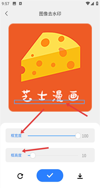 3、在圖像去水印操作頁面,需要手動在圖像上規(guī)劃藍(lán)框的位置對文字進(jìn)行消除,或者拉動底下的框?qū)挾群透叨葪l進(jìn)行調(diào)整。