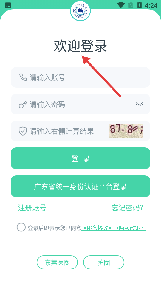 1、登錄界面上方顯示歡迎登錄,設(shè)有賬號、密碼輸入框及驗證碼計算區(qū)域,還支持廣東省統(tǒng)一身份認證平臺登錄。