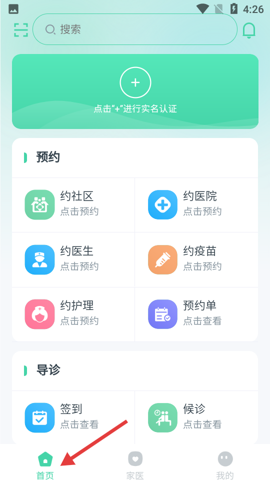 2、首頁布局清晰,中部加號用于實名認證,下方分預(yù)約、導(dǎo)診兩大板塊,提供社區(qū)、醫(yī)院等多種預(yù)約及簽到、候診功能。