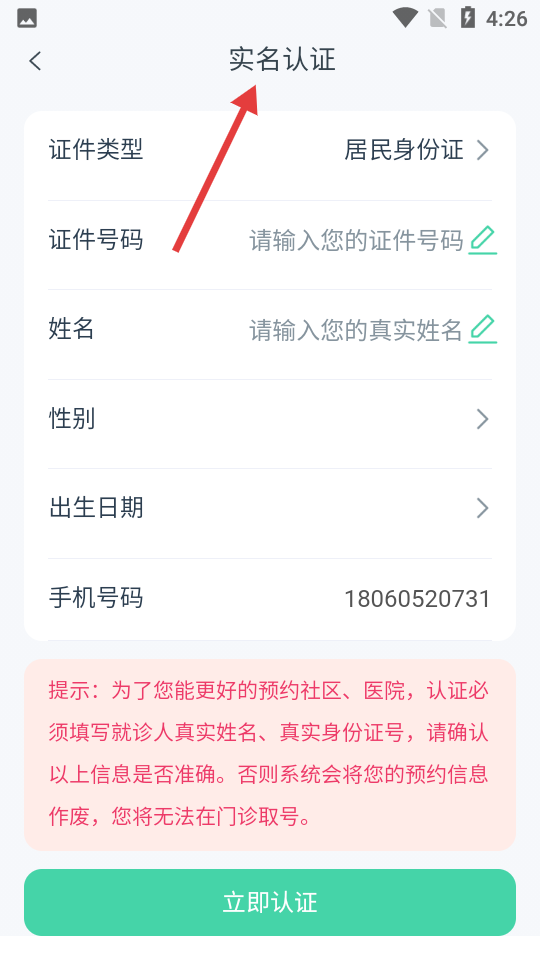 3、實名認證頁面,提示需填寫真實身份信息,包括證件類型、號碼、姓名等,下方有信息準確性提示和立即認證按鈕。