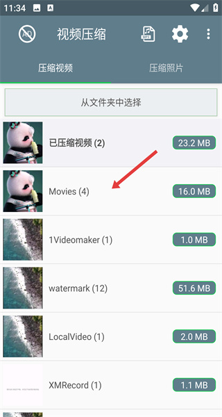 1、進入視頻壓縮應(yīng)用,點擊從文件夾中選擇,找到并選中存有目標(biāo)視頻的文件夾。