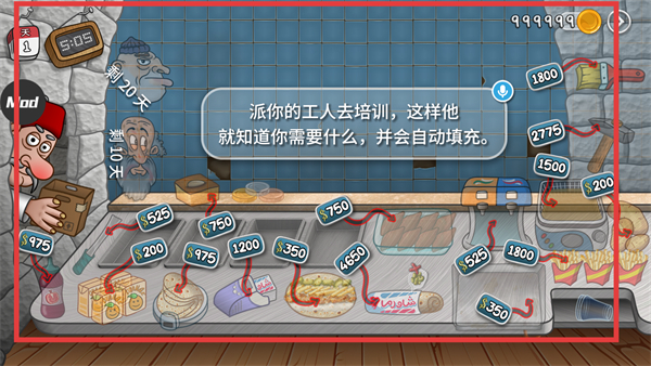 4、玩家需要合理規(guī)劃資源,對食材、設(shè)備等進行升級,同時派工人培訓,讓其自動填充所需物品提高運營效率,從而獲取更多資源。