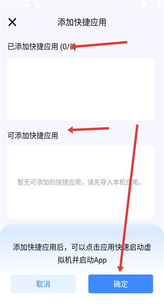 2、進(jìn)入添加快捷應(yīng)用界面查看已添加數(shù)量,若無可添加項(xiàng)需先導(dǎo)入本機(jī)應(yīng)用,確認(rèn)設(shè)置后點(diǎn)擊確定后續(xù)可快速啟動虛擬機(jī)及對應(yīng)App。