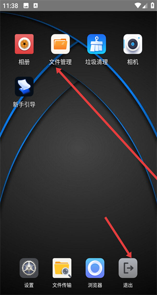 3、在虛擬機(jī)桌面點(diǎn)擊文件管理可瀏覽存儲內(nèi)容查看導(dǎo)入的應(yīng)用,新手引導(dǎo)能夠幫助快速熟悉操作,退出按鈕可關(guān)閉虛擬機(jī)便捷管理桌面應(yīng)用。