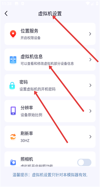 4、進(jìn)入虛擬機(jī)設(shè)置頁可開啟位置服務(wù)授權(quán),查看并修改虛擬機(jī)設(shè)備信息設(shè)置開機(jī)密碼,還能調(diào)整分辨率刷新率及相機(jī)拍攝權(quán)限按需配置功能。