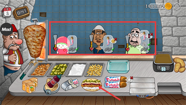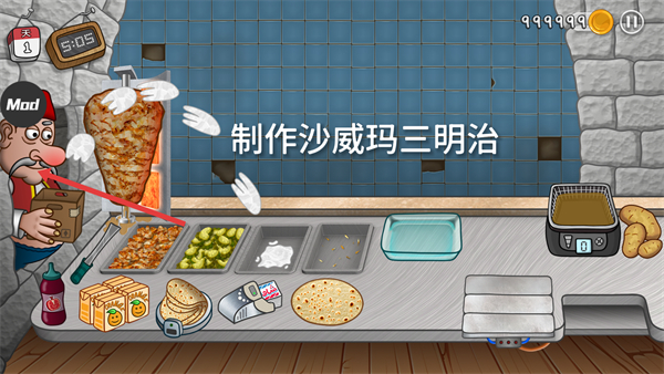 1、游戲開始時(shí)點(diǎn)擊工人讓其自動(dòng)填充制作沙威瑪三明治的食材,待食材填充完畢后,即可開始接待顧客,按步驟制作三明治開啟經(jīng)營。