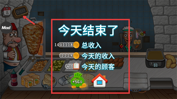 4、一天經(jīng)營結(jié)束后,可以查看總收入、當(dāng)日收入和顧客數(shù)量,總結(jié)經(jīng)營情況為后續(xù)優(yōu)化三明治制作流程、提升經(jīng)營效益提供參考。