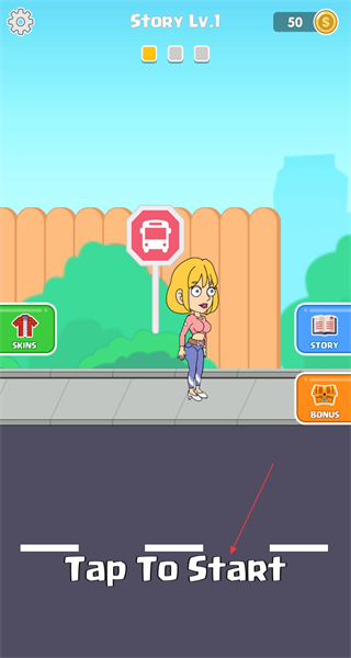 1、打開游戲后,進入第一關開始界面,看到角色與Tap To Start提示,點擊該提示,觸發(fā)劇情發(fā)展,進入帶有HELP字樣的求助場景。