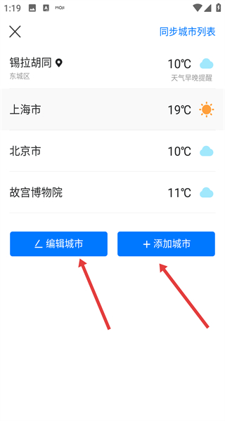 2、在城市列表底部點(diǎn)擊編輯城市可管理已添加城市,點(diǎn)擊添加城市進(jìn)入選城界面靈活調(diào)整關(guān)注的城市天氣數(shù)據(jù)。