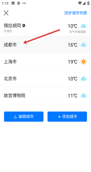 4、在城市列表頁(yè)可查看已添加城市如錫拉胡同成都市等的實(shí)時(shí)溫度與天氣狀態(tài),快速了解多城氣候方便規(guī)劃出行直觀掌握天氣信息。