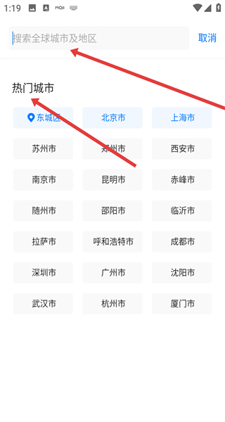 3、進(jìn)入添加城市頁(yè)通過(guò)頂部搜索框輸入城市名,或選擇熱門城市如東城區(qū)蘇州市等,快速添加新城市拓展天氣查看范圍。