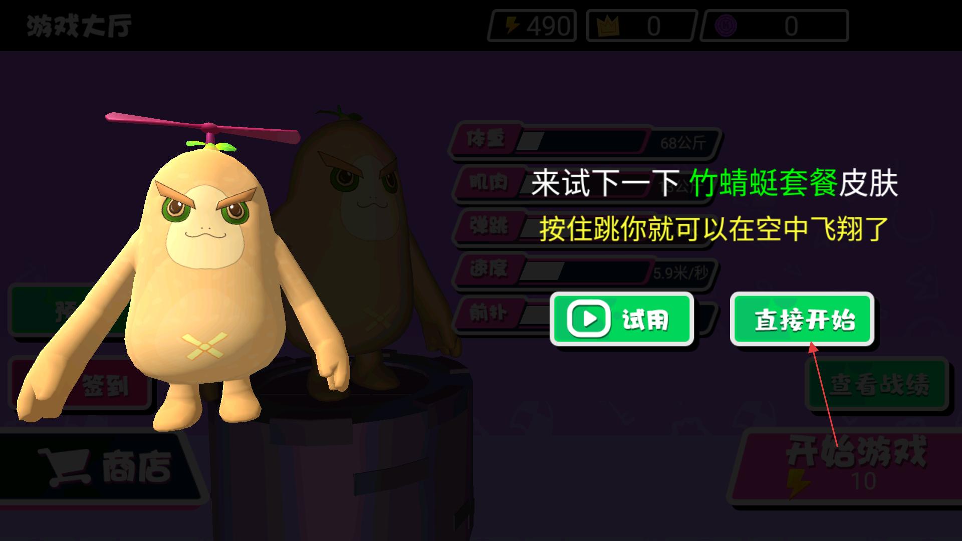 3、接著看到竹蜻蜓套餐皮膚的試用和直接開始選項(xiàng),點(diǎn)擊直接開始,進(jìn)入游戲進(jìn)程,開啟游戲挑戰(zhàn)。