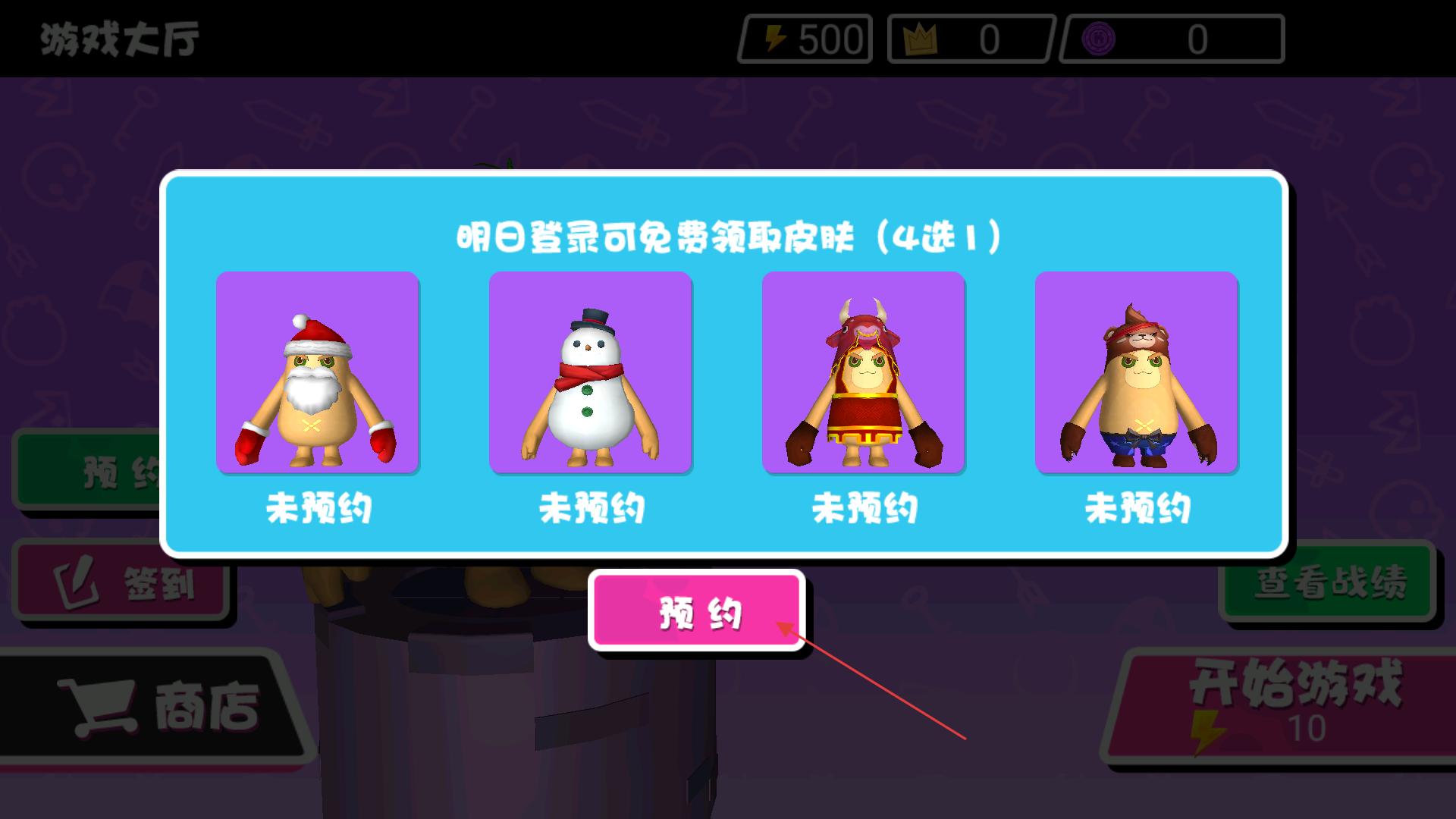 1、打開游戲后,遇到明日登錄免費(fèi)領(lǐng)皮膚的預(yù)約提示,選擇喜歡的皮膚,點(diǎn)擊預(yù)約按鈕,完成皮膚預(yù)約操作,以便后續(xù)領(lǐng)取。