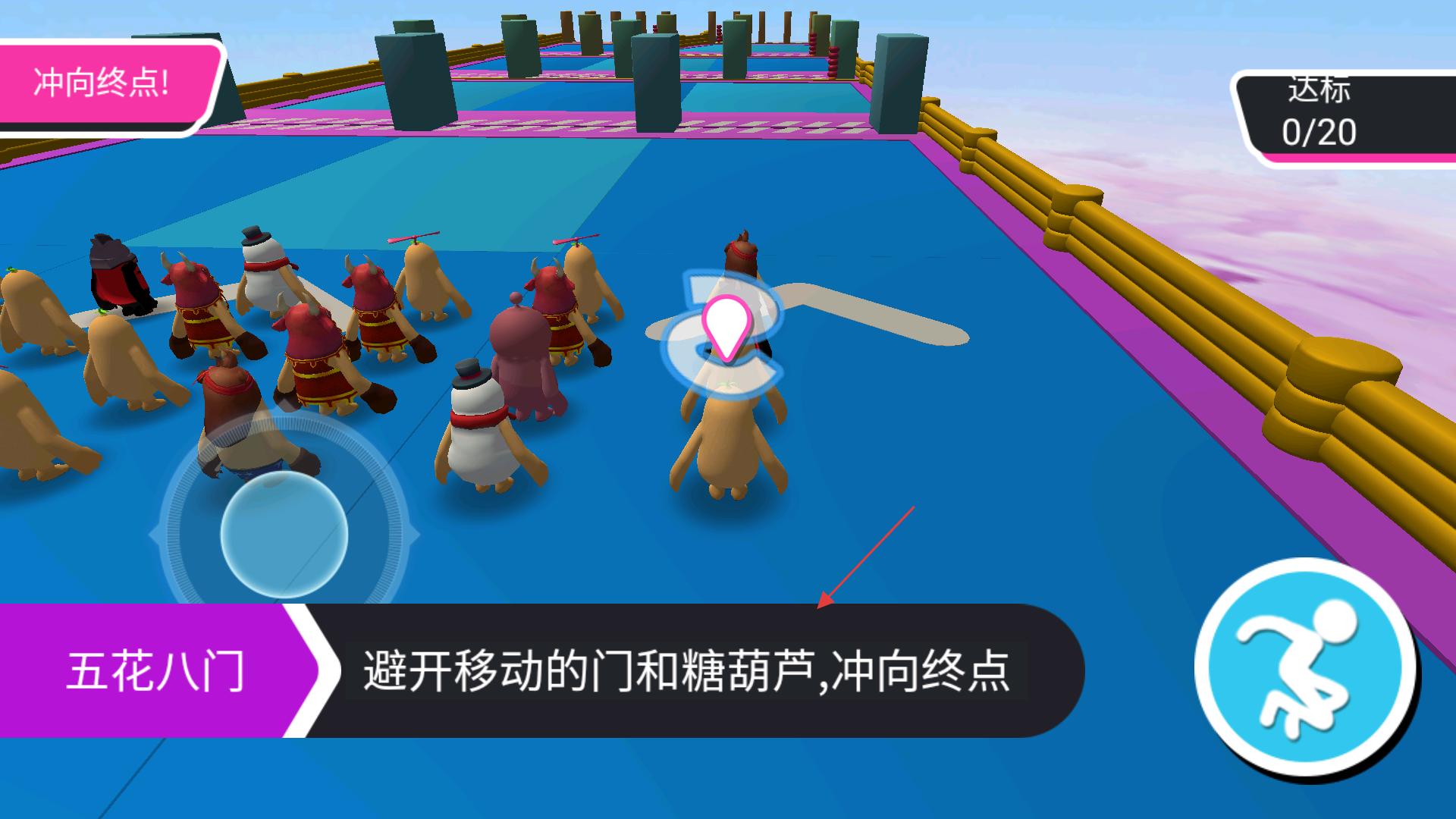 4、進(jìn)入游戲關(guān)卡,看到需避開移動(dòng)的門和糖葫蘆沖向終點(diǎn)的提示,操控角色在賽道上前進(jìn),躲避障礙,朝著終點(diǎn)方向移動(dòng),開展關(guān)卡挑戰(zhàn)。