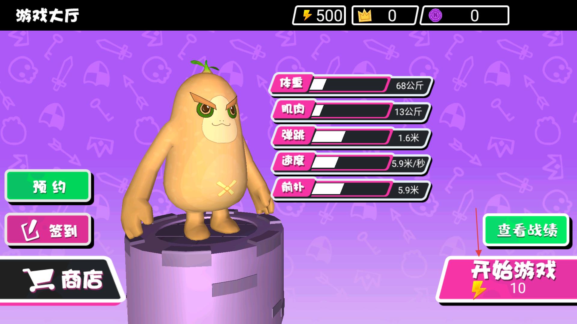 2、在游戲界面查看角色的體重、肌肉等屬性后,點(diǎn)擊開始游戲按鈕,消耗對(duì)應(yīng)資源,進(jìn)入游戲關(guān)卡,準(zhǔn)備開始挑戰(zhàn)。
