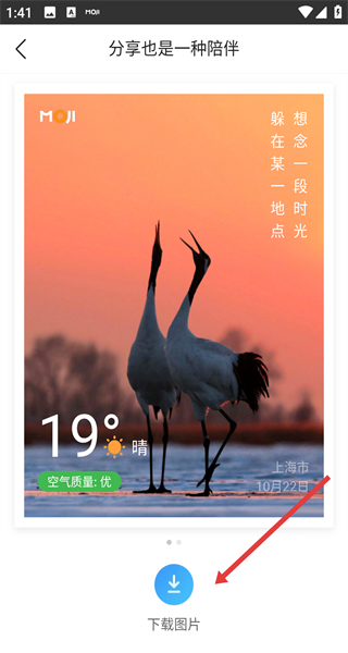 4、在天氣海報分享界面點(diǎn)擊底部下載圖片,可保存含城市上海市溫度空氣質(zhì)量優(yōu)及詩意文案的畫面,留存天氣場景方便后續(xù)查看或分享。