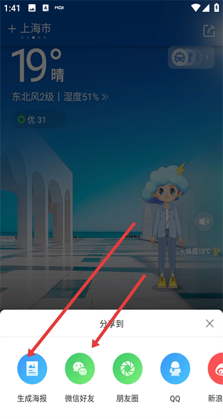 3、打開天氣詳情頁分享選項可選擇生成海報發(fā)送微信好友或朋友圈等,快速將當(dāng)前城市上海市天氣信息傳遞給他人實現(xiàn)天氣分享互動。