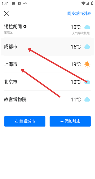 1、在城市列表頁查看已添加城市如成都市和上海市的溫度,通過編輯城市調(diào)整列表或添加城市拓展關(guān)注范圍靈活管理多城天氣信息。
