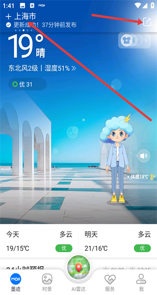 2、進(jìn)入天氣詳情頁點(diǎn)擊右上角分享圖標(biāo),能同步天氣數(shù)據(jù)至其他平臺,或直接分享給好友高效傳遞所在城市如上海市的實時氣候狀態(tài)。